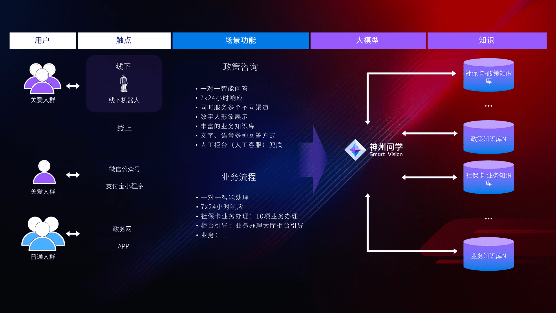 • 线上线下全覆盖:线上提供微信公众号、、支付宝小程序、、、政务网、、、app多种渠道,,,与线下机器人形成完整服务体系。。