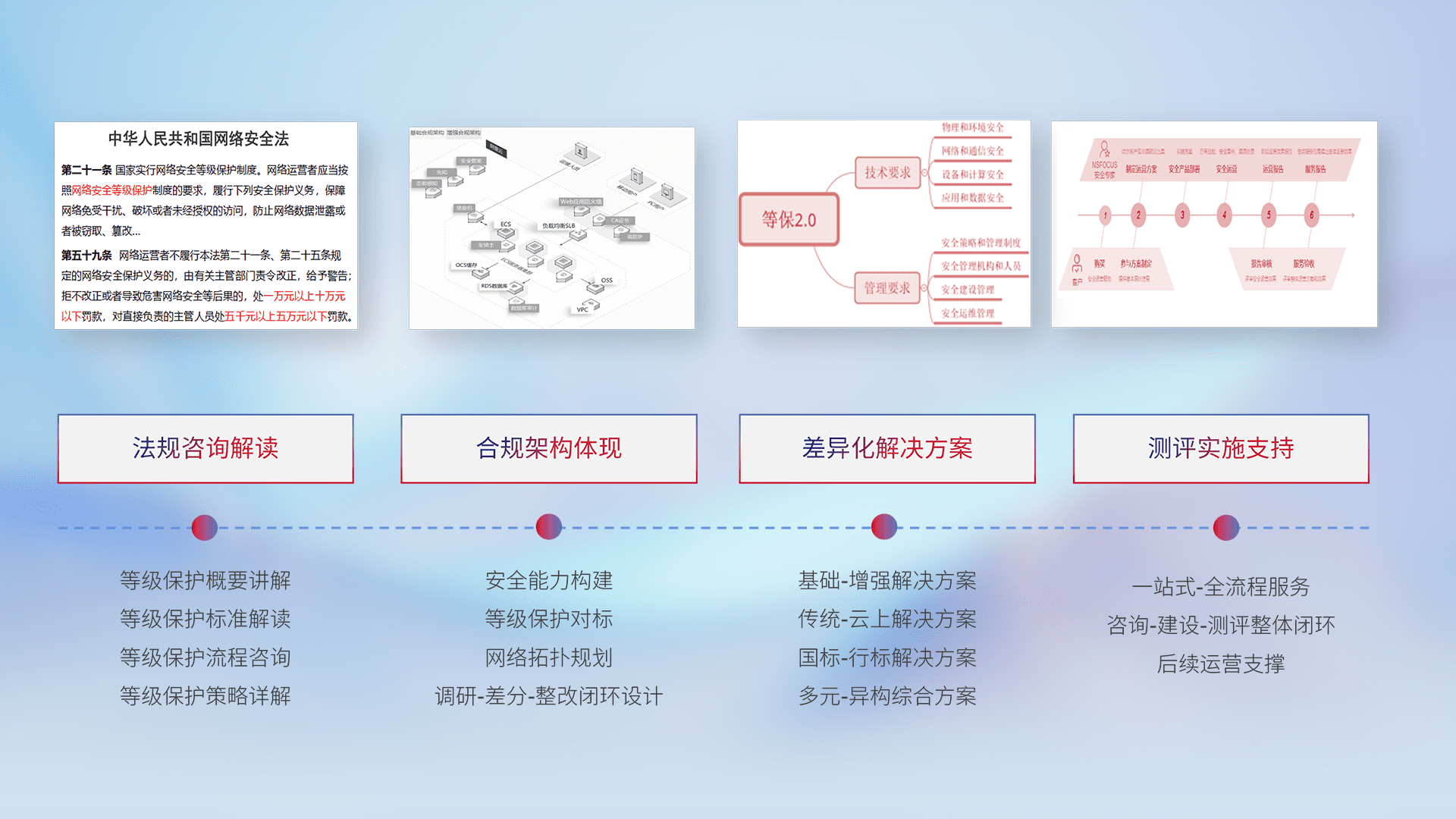 通过专业的法律咨询解读、、、、合规架构体现、、、差异化解决方案、、测试实施支持等服务,,,,为客户量身打造等保合规体系。。。